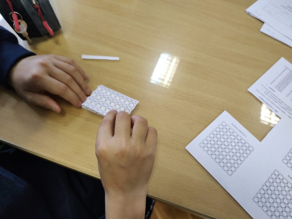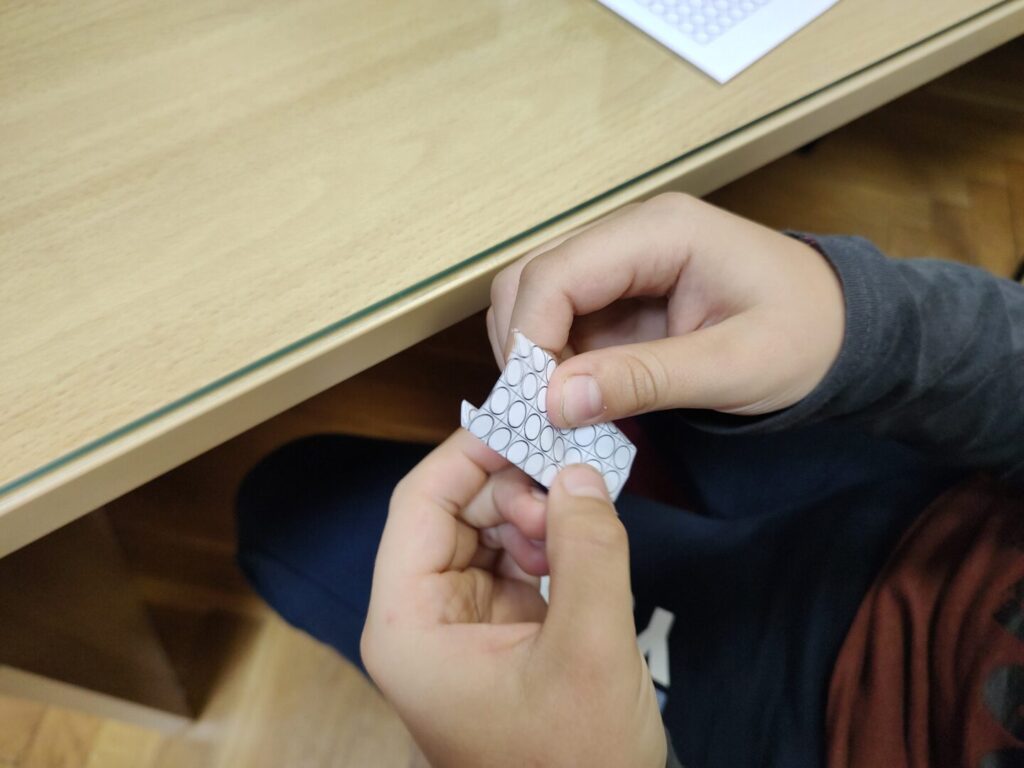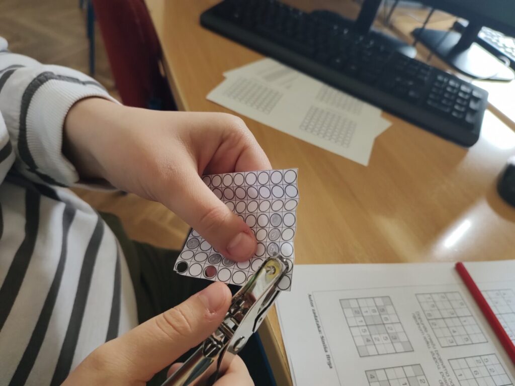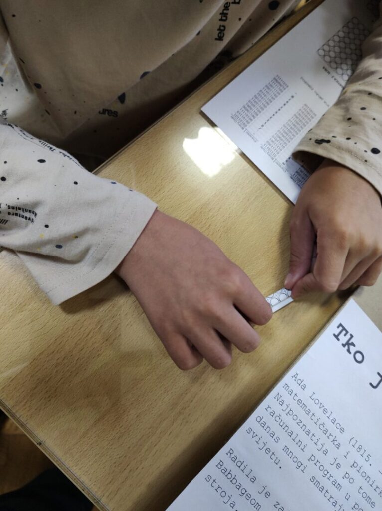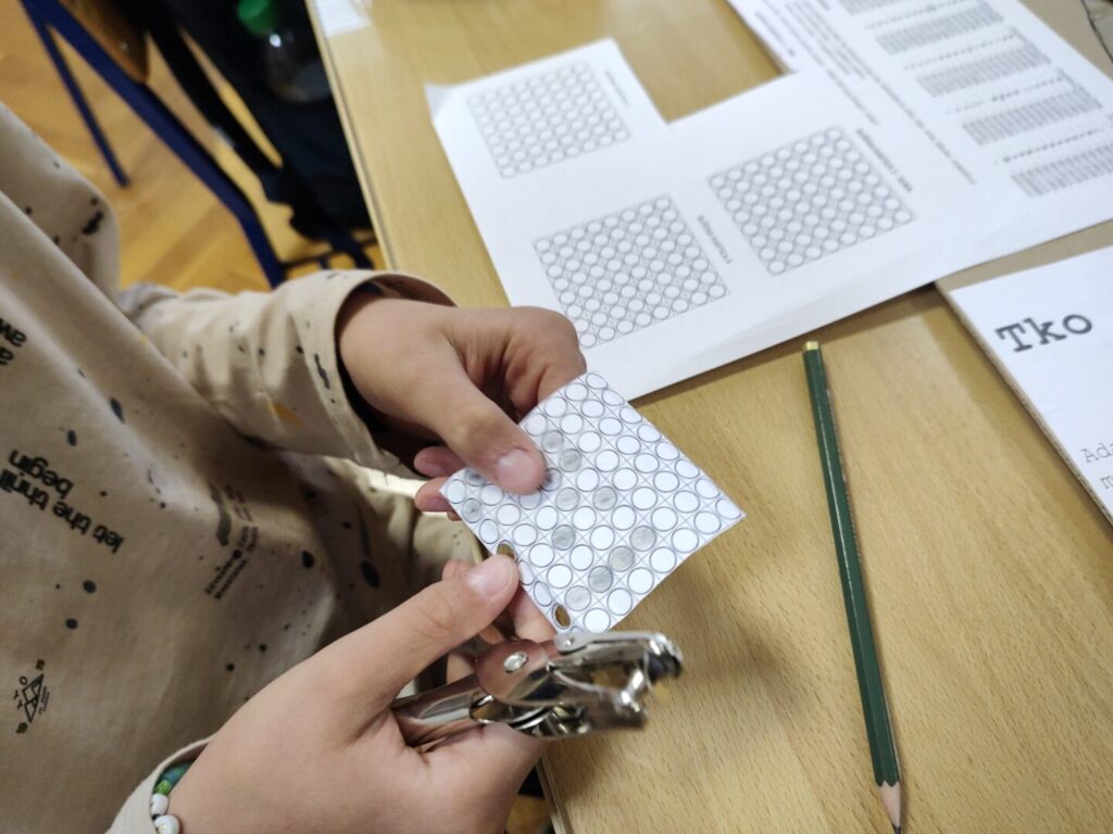 Na dodatnoj nastavi informatike učenici su se okušali u kodiranju binarnim kodom, inspirirani bušenim karticama koje su se koristile u ranim računalima. Svaki učenik je pretvorio svoje ime u binarni zapis i bušio rupice na predlošku s mrežom 8×8 kružića – tamo gdje je bila binarna jedinica “1”, nastala je rupica, a “0” je ostala netaknuta.