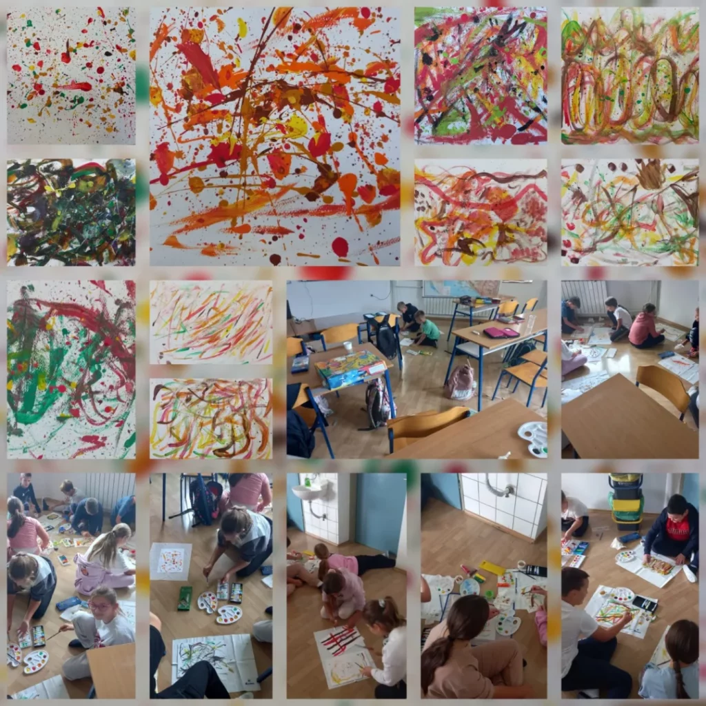 Učenici su se upoznali s američkim slikarom Jacksonom Pollockom, poznatim po slikanju pokretom. Poput Pollocka, boju su kapali, prskali i prolijevali po podlozi smještenoj na podu, usklađujući svoje pokrete s ritmom i osjećajima koje u njima budi jesen. Kroz igru pokreta i boje izražavali su energiju, promjene i raspoloženja jesenskih dana, stvarajući slike pune dinamike i osobnog izraza.
