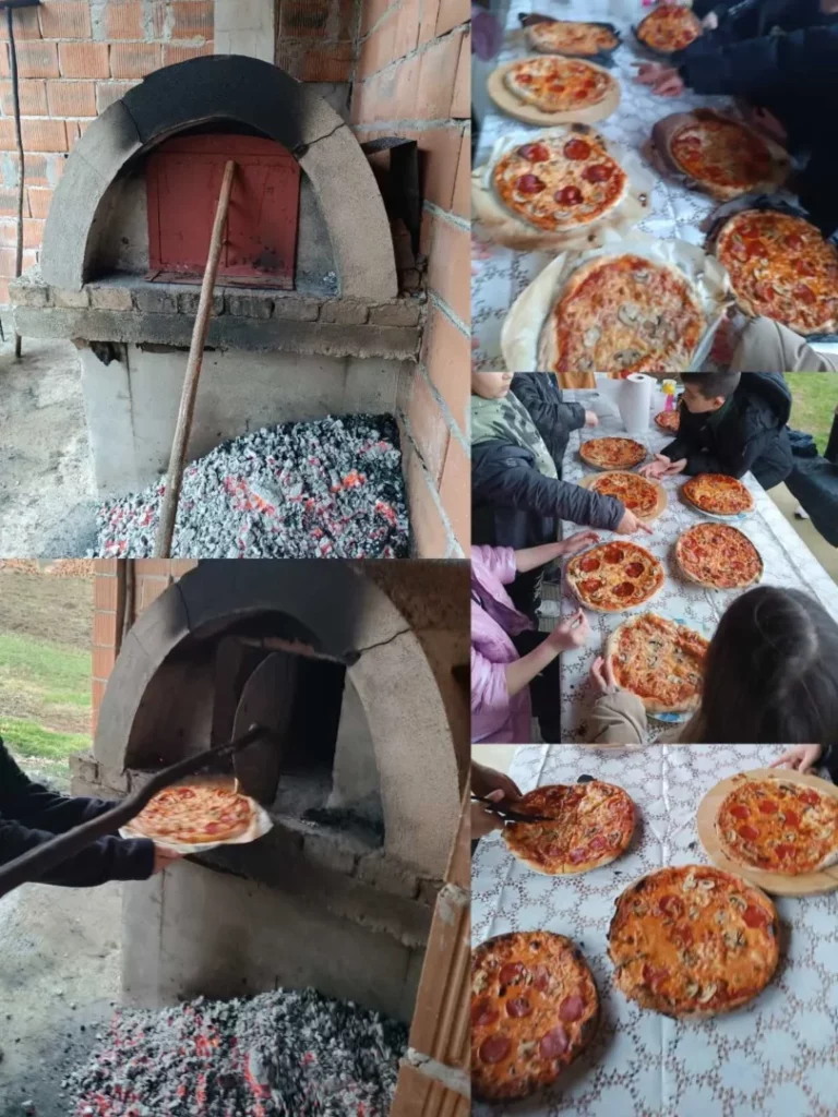 Sretni smo što u selu još uvijek postoje krušne peći, pa smo, u dogovoru s roditeljima učenika Antonija, odlučili i napraviti pizzu i ispeći je u krušnoj peći. Tijesto nam je pripremio gospodin Jonjić, odličan Pizzaiolo. Tijesto je odležalo 24 sata. Točno izvagane loptice, svaka jednake gramaže, nježno spakirane, spremno su čekale vješte prste koji će ih oblikovati u pizze veličine lopate za krušnu peć. Uputili smo se domaćinima koji su nas srdačno dočekali. Dok smo se približavali kući mogli smo uočiti i osjetiti dim iz peći. Antonijev otac nam je demonstrirao kako se koristi krušna peć i kako se uz pomoć pera provjerava temperatura peći. Dok se postizala idealna temperatura peći i naše pizze su dobivale željeni izgled. Svatko je na svoju pizzu stavio sastojke koje voli i želi. U svega nekoliko minuta naše pizze su bile pečene. S nestrpljenjem smo čekali trenutak kušanja. Nedvojbeno ovo je bila najfinija pizza koju smo ikad probali. Ovo svakako moramo ponoviti.